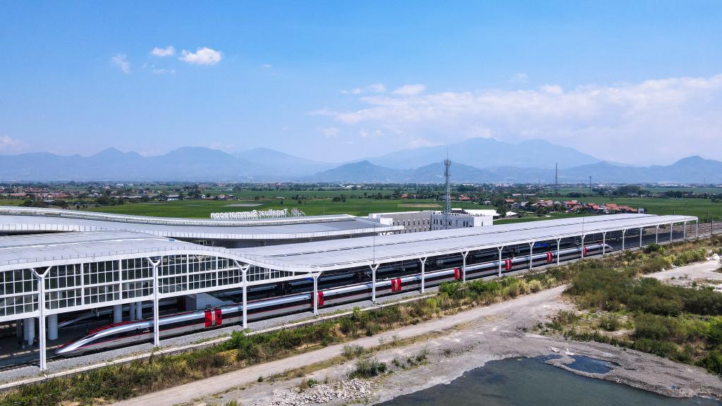 圖為2024年9月13日在印度尼西亞萬隆德卡魯爾站拍攝的??吭谡九_上的雅萬高鐵高速動車組(無人機照片)。新華社記者徐欽攝