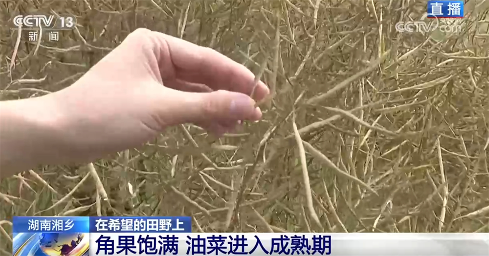 記者來到了湘潭湘鄉(xiāng)市泉塘鎮(zhèn)雙江村,油菜現(xiàn)在長得怎么樣了?油菜的頂端已經(jīng)呈金黃色,角果很飽滿,我們平時常說的油菜籽就藏在金黃色的角果里,這說明現(xiàn)在油菜已經(jīng)進入成熟期了。