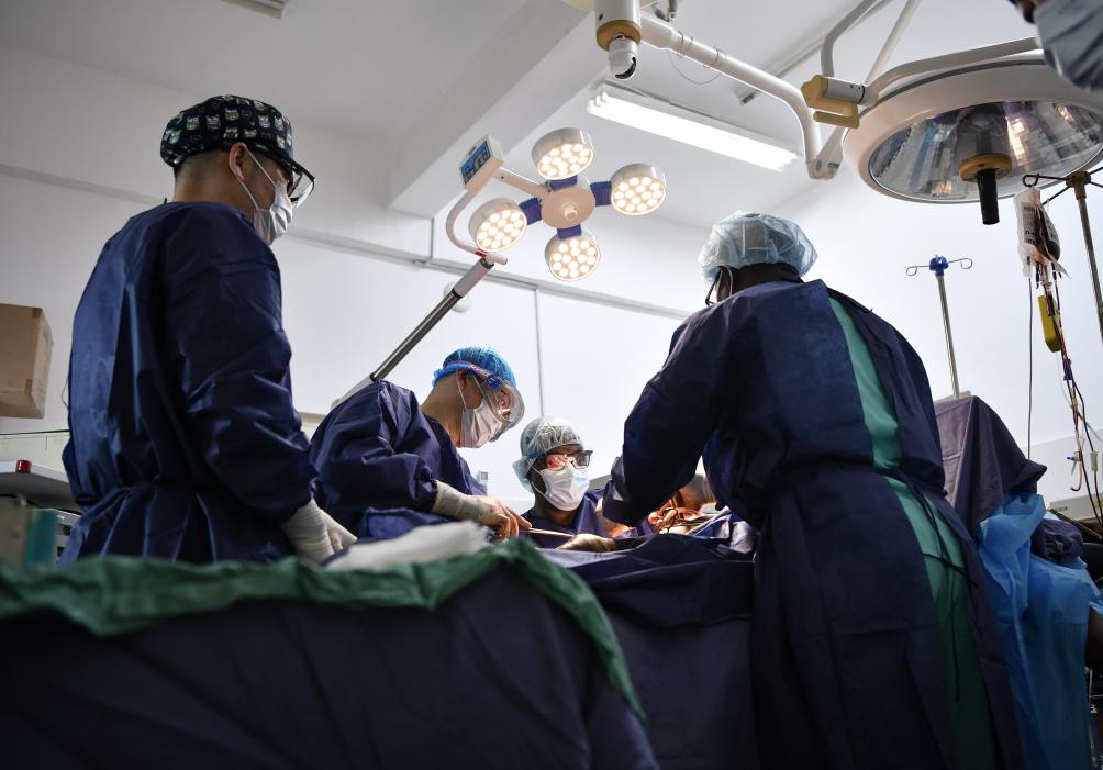 2025年4月29日,在位于幾內(nèi)亞首都科納克里的中幾友好醫(yī)院,中方醫(yī)生與當(dāng)?shù)蒯t(yī)生為患者做手術(shù)。新華社記者韓旭攝