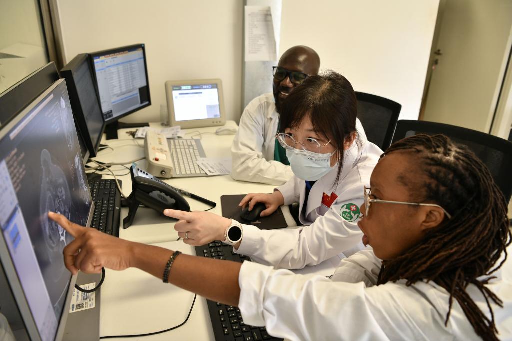 此刻,一名幾內(nèi)亞青年醫(yī)生正在骨科手術(shù)室觀摩骨科AI智能診斷及手術(shù)模擬規(guī)劃,他的白大褂口袋里還揣著在北京培訓(xùn)時(shí)的筆記;急診科的中幾醫(yī)護(hù)團(tuán)隊(duì)又接到了新的搶救任務(wù),走廊里響起急促的腳步聲。