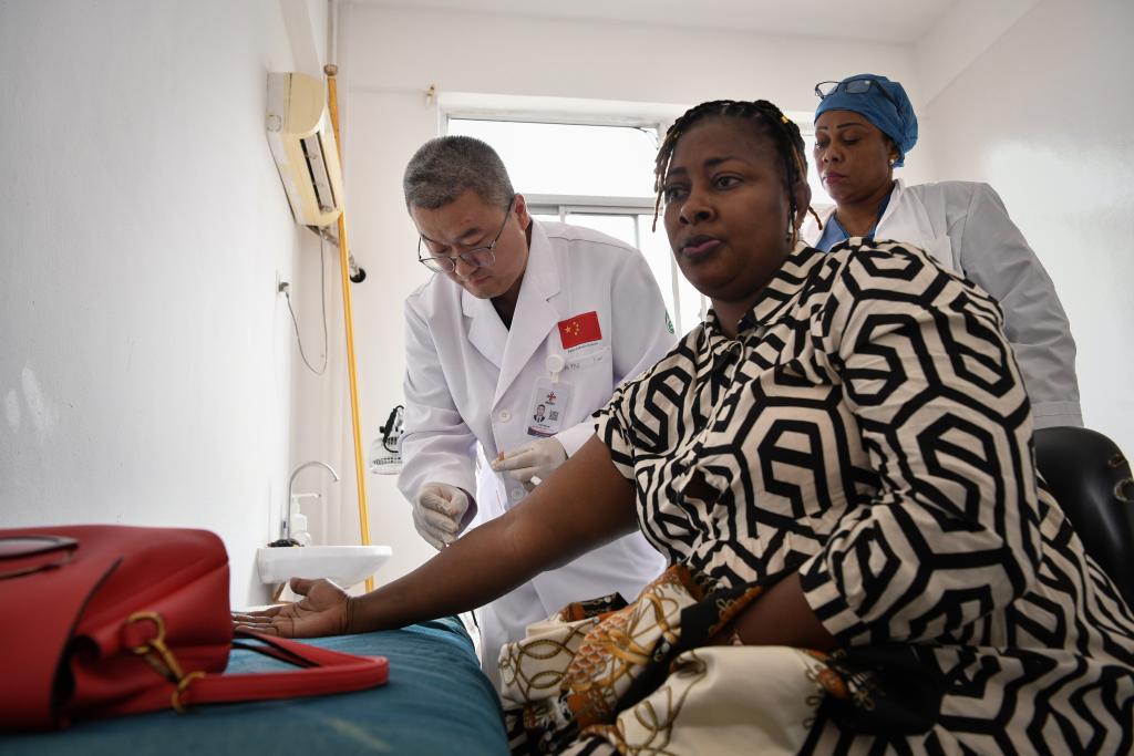 2025年4月29日,在位于幾內(nèi)亞首都科納克里的中幾友好醫(yī)院,中國(guó)醫(yī)療隊(duì)醫(yī)生劉路遙為患者做針灸治療。新華社記者韓旭攝
