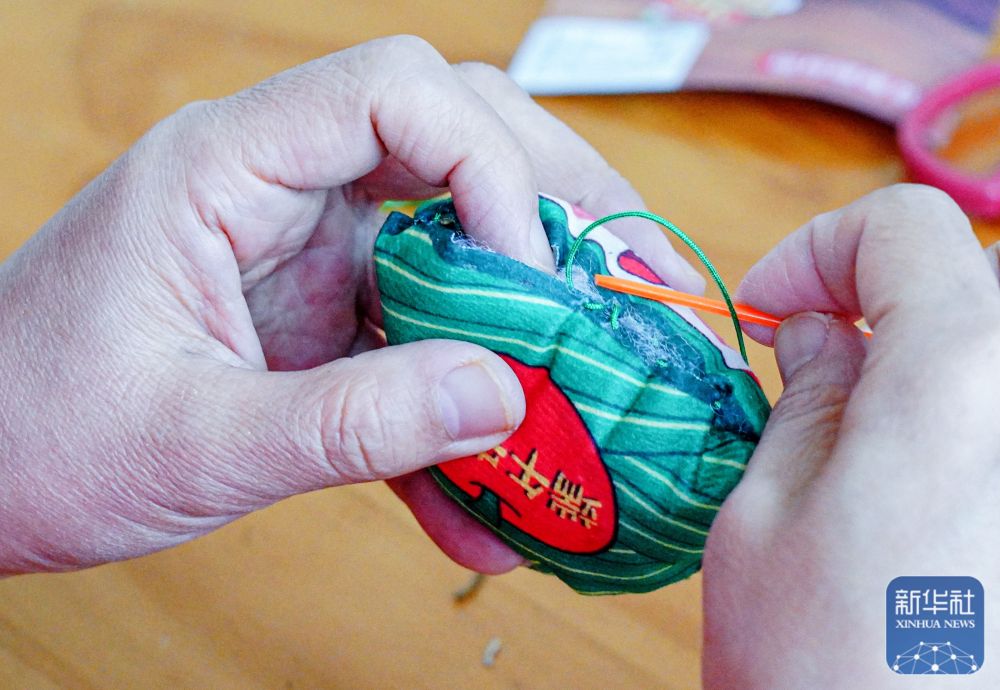 5月23日,志愿者在山東省榮成市新時代文明實踐中心制作香囊,準(zhǔn)備送給孤寡老人。新華社發(fā)(李信君攝)