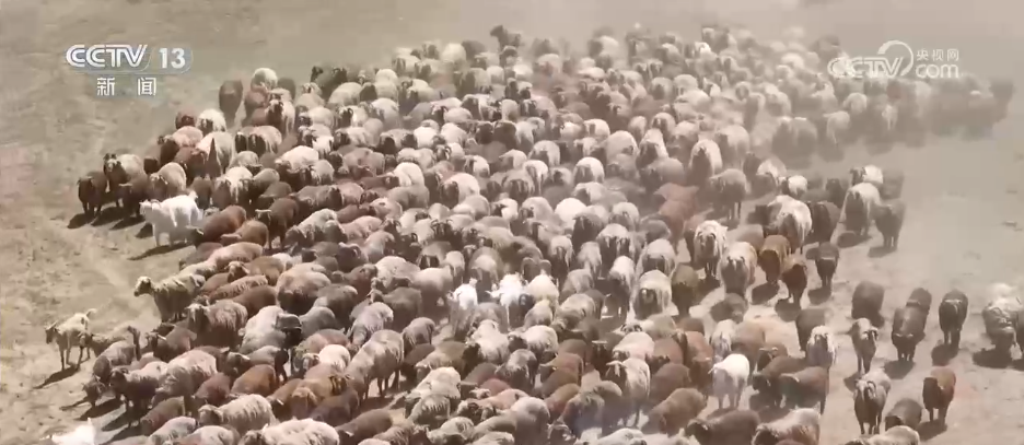 在新疆阿勒泰福海縣的沙爾布拉克草原,當?shù)啬撩翊┲恋奶厣棧瑤е耶?,趕著牛羊,正在進行轉場。今年有45萬頭的牛羊經過沙爾布拉克草原千年牧道,轉場到水草豐美的夏牧場。