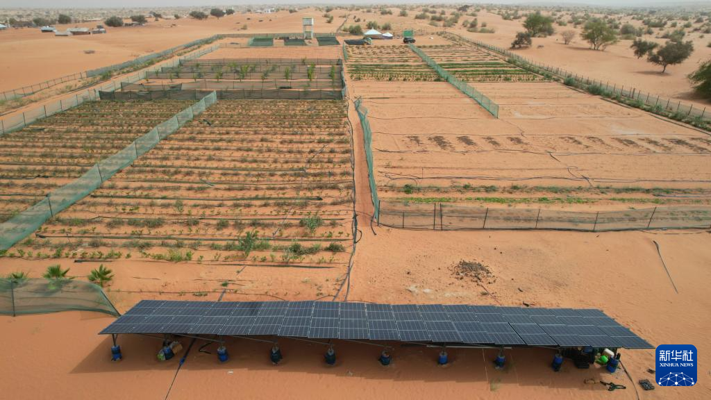 頭頂驕陽,腳踩熱沙,在毛里塔尼亞西部特拉扎區(qū)比爾·巴爾卡村沙地上,一排排滴灌管線沿著整齊壟溝延伸,嫩綠的果蔬苗從黃色沙土中破土而出。一旁的太陽能板正源源不斷將光能轉(zhuǎn)化為電力,驅(qū)動水泵將地下水送至田間。放眼望去,昔日寸草不生的荒漠,如今分區(qū)布設(shè)、綠意漸起,一幅沙漠變綠洲的畫卷正悄然展開。