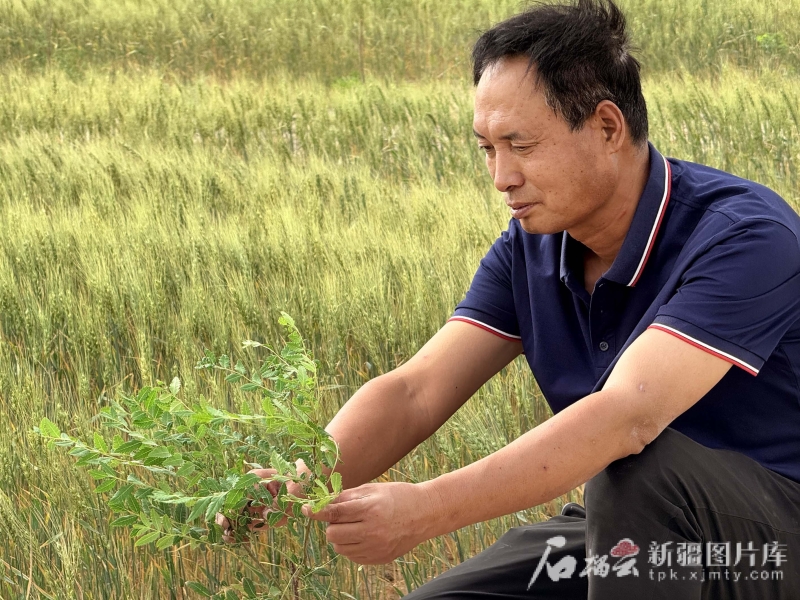 6月13日,且末縣老兵治沙隊(duì)創(chuàng)始人田來群在查看文冠果苗生長情況。