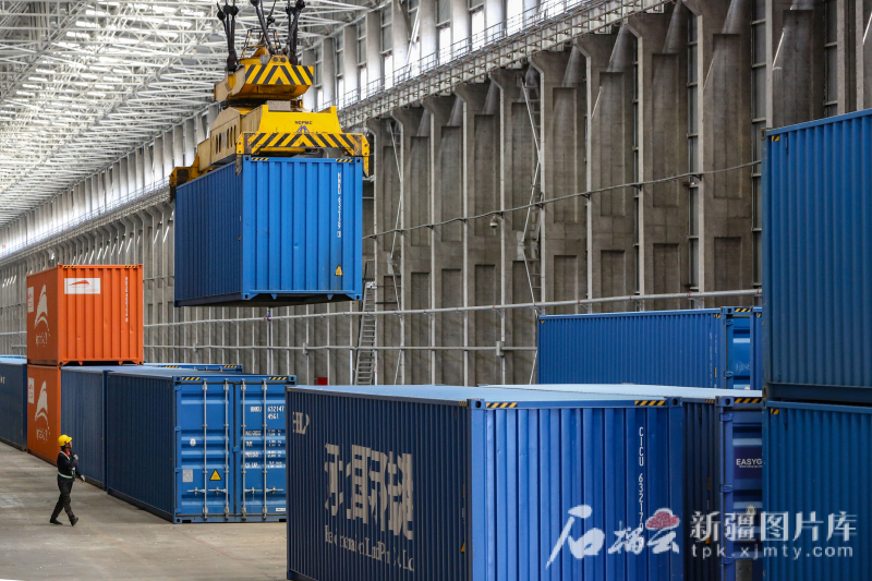 6月24日,阿拉山口站中歐(中亞)班列換裝區(qū)內(nèi)的行車(chē)在吊裝集裝箱。蔡增樂(lè) 攝