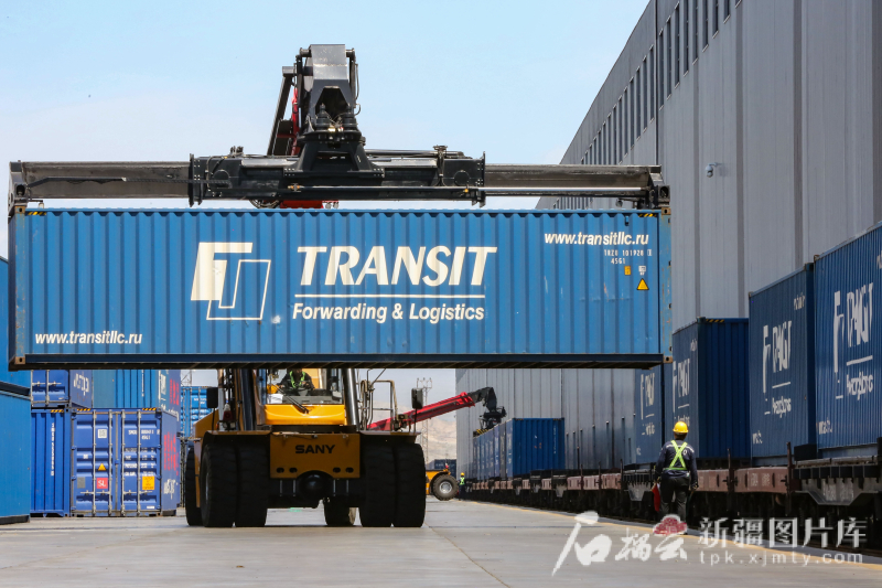 6月24日,阿拉山口站中歐(中亞)班列換裝區(qū)正面吊轉(zhuǎn)運(yùn)集裝箱。蔡增樂(lè) 攝