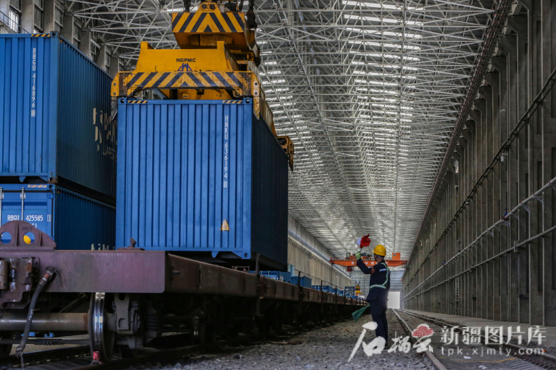 6月24日,工作人員在阿拉山口站中歐(中亞)班列換裝區(qū)指揮行車(chē)吊裝集裝箱。蔡增樂(lè) 攝