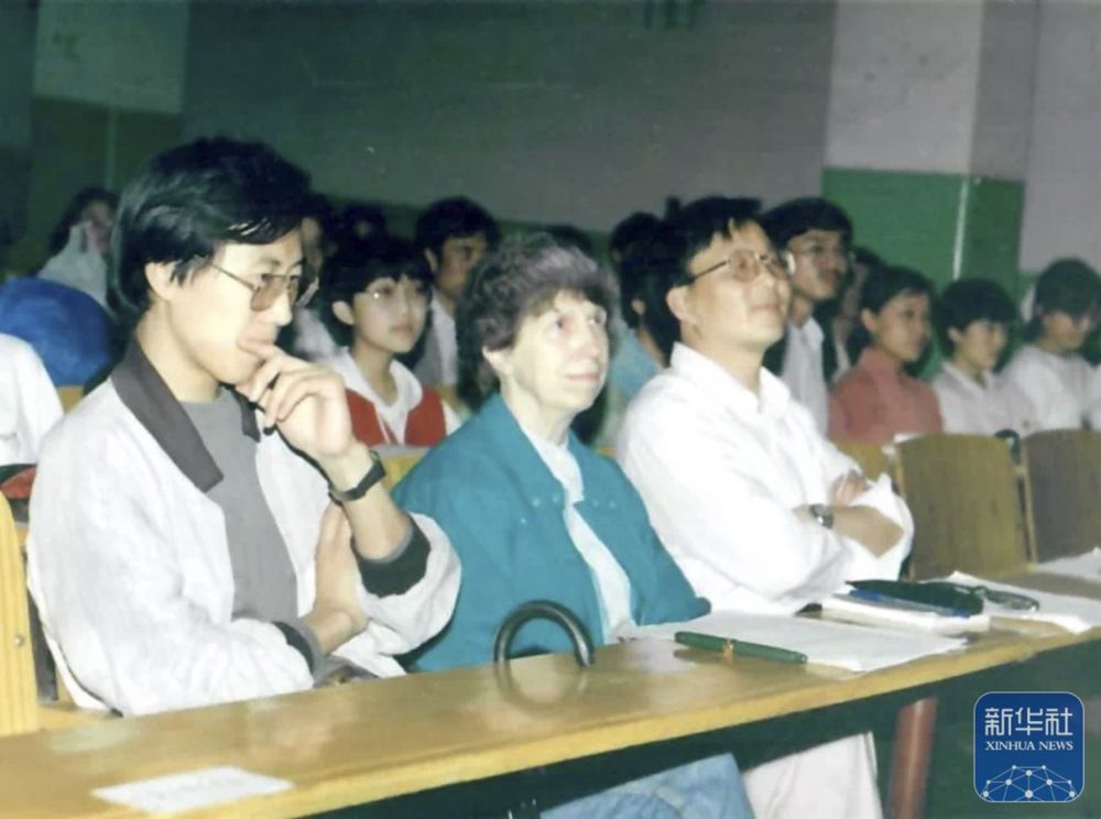 20世紀(jì)80年代,白麗詩(前中)在上海外國語大學(xué)任教時的工作照(翻拍照片)。
