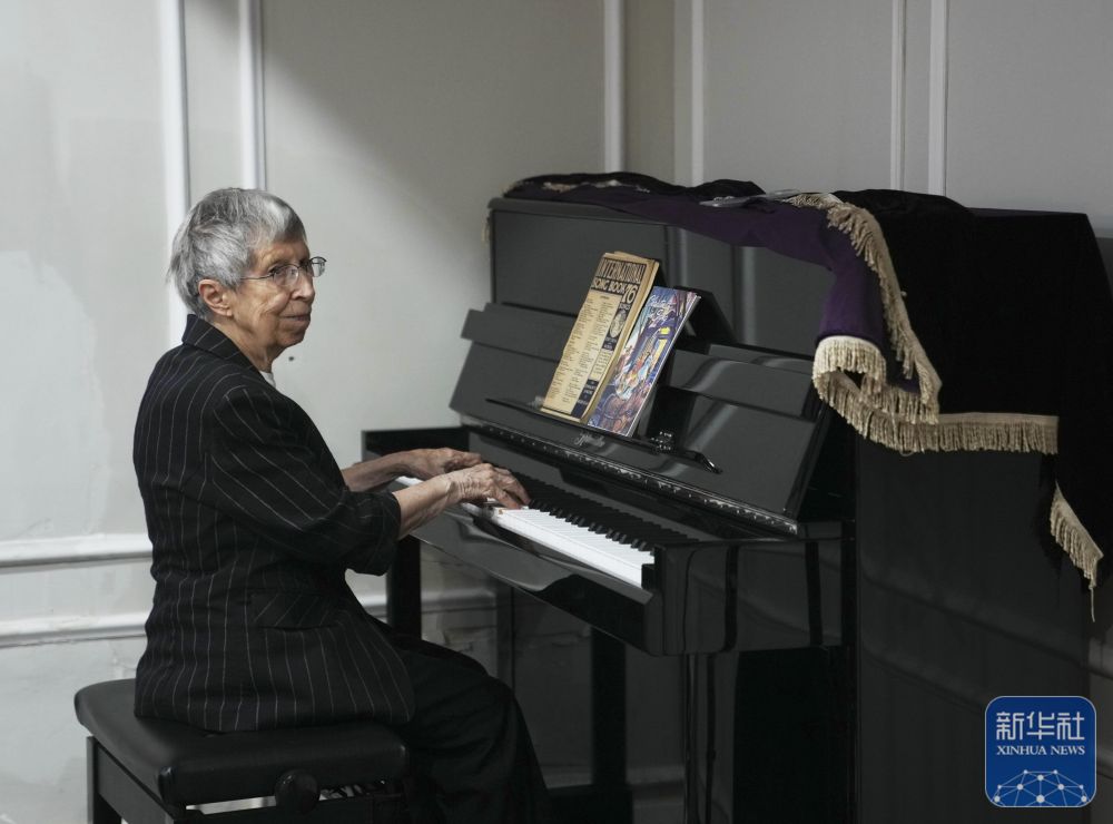 2025年6月13日,白麗詩在養(yǎng)老院的多功能廳彈鋼琴。