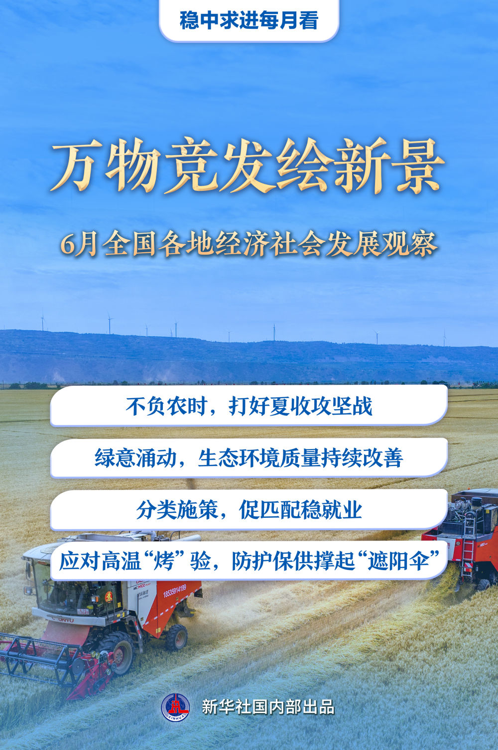 6月仲夏,萬物豐茂。廣袤農(nóng)田上,“三夏”生產(chǎn)進入關(guān)鍵階段;綠水青山間,低碳發(fā)展不斷繪就新圖景;全力穩(wěn)就業(yè),政府、企業(yè)與高校同頻共振;高溫“烤”驗下,做好各項保障工作……上半年收官之月,各地各部門統(tǒng)籌推進穩(wěn)增長、促改革、惠民生舉措,推動經(jīng)濟社會沿著高質(zhì)量發(fā)展之路穩(wěn)步前行。