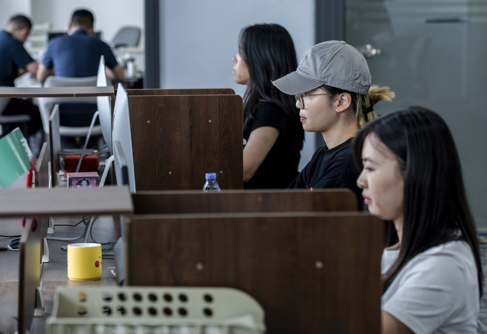 來(lái)自華僑大學(xué)的臺(tái)灣學(xué)生(右二)在廈門(mén)“臺(tái)青創(chuàng)客家”里實(shí)習(xí)(2024年6月14日攝)。新華社記者 魏培全 攝