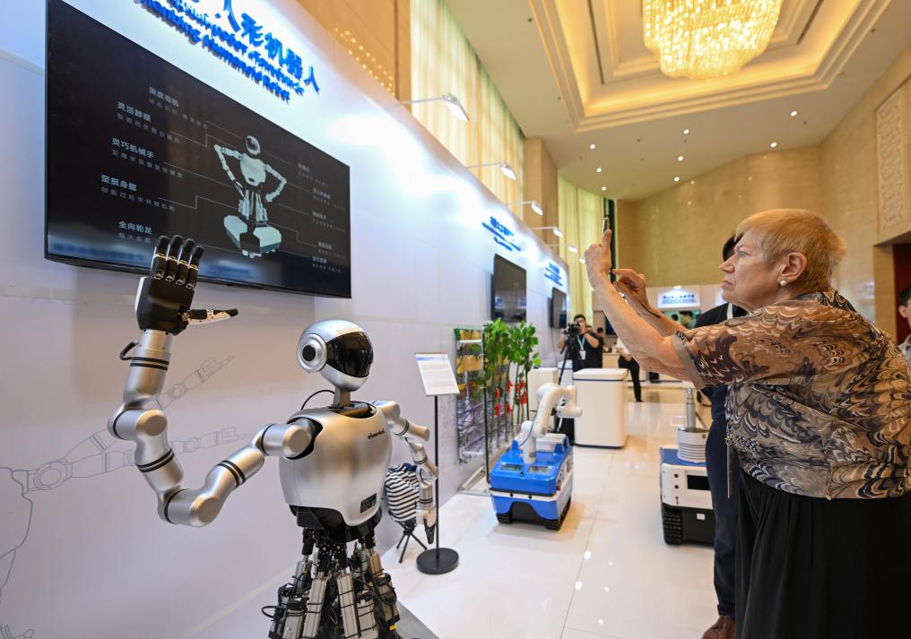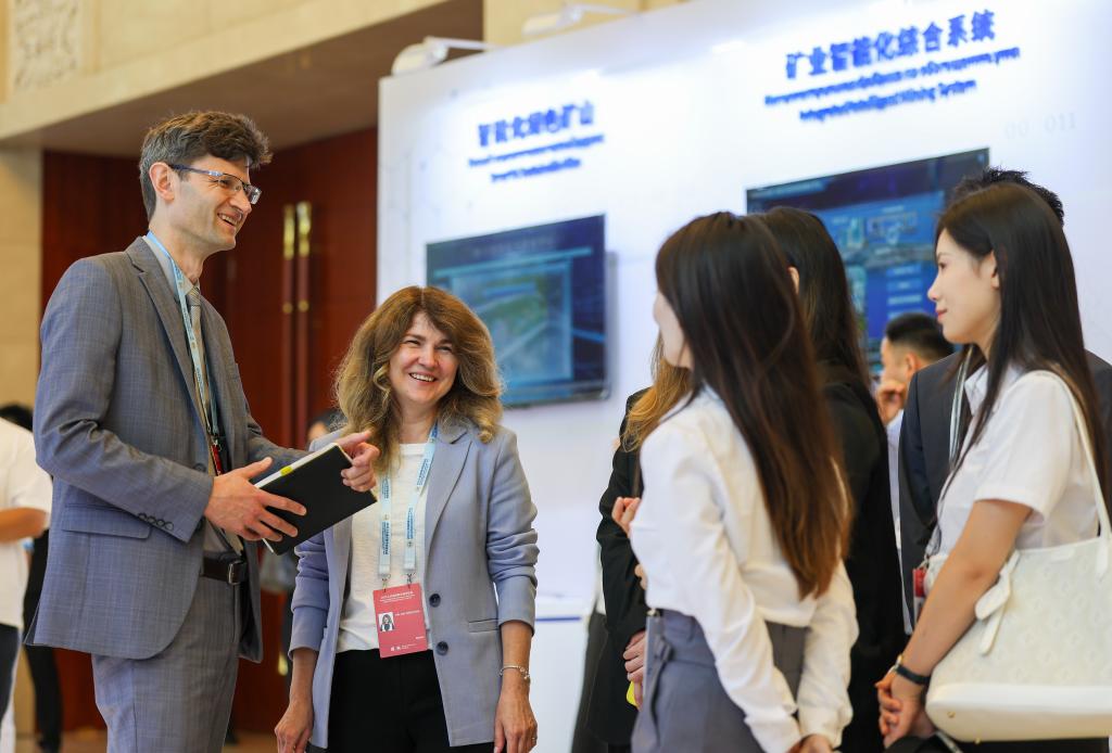 7月11日,參會嘉賓在2025上合組織數(shù)字經(jīng)濟論壇互動體驗區(qū)與參展企業(yè)工作人員交流。新華社記者 孫凡越 攝