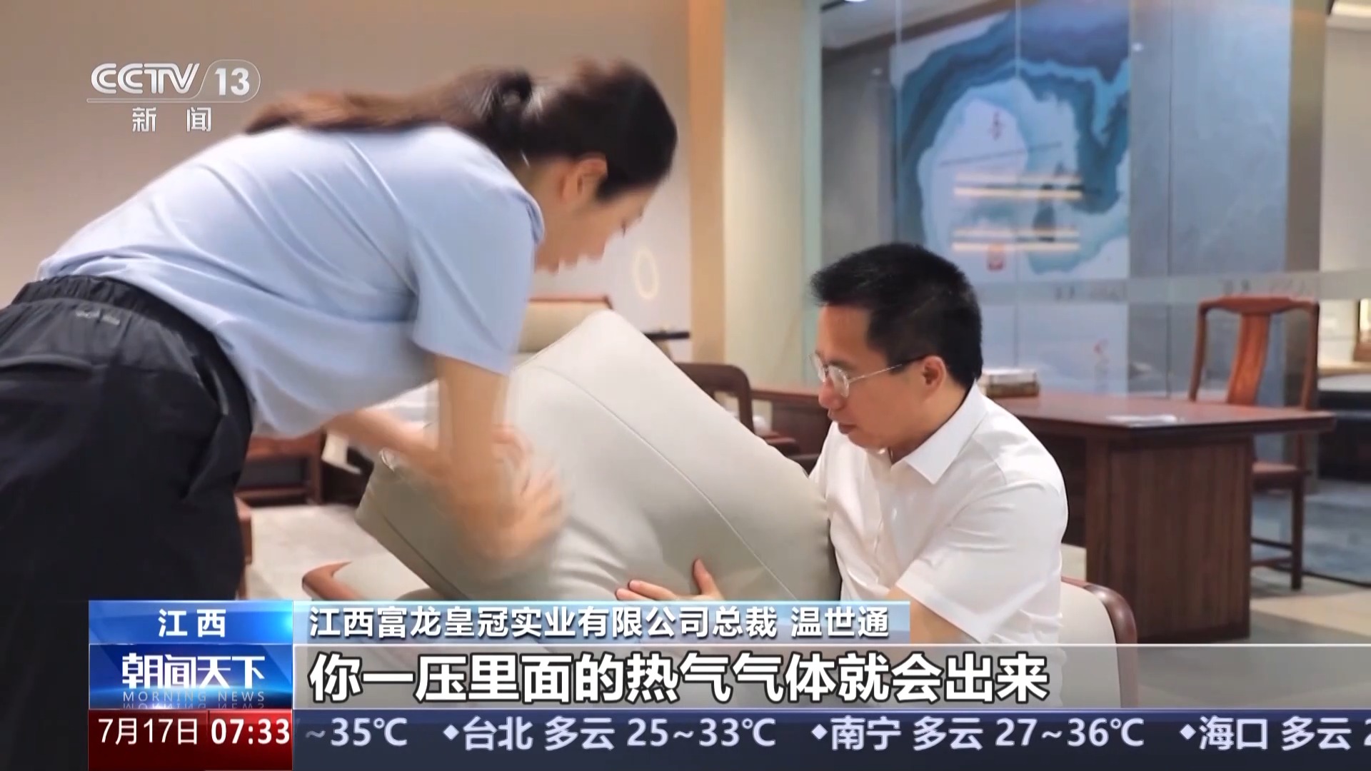 江西富龍皇冠實(shí)業(yè)有限公司總裁 溫世通:沙發(fā)靠墊后面我們?nèi)看蛄送笟饪祝粔豪锩娴臒釟鈿怏w就會(huì)出來(lái),保證背部不會(huì)有很熱很燙的感覺(jué),在銷售方面保持增長(zhǎng)。