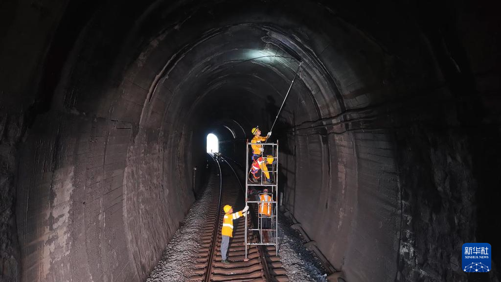 橋隧工人對隧道頂部危石隱患點進(jìn)行加固(7月15日攝,無人機照片)。
