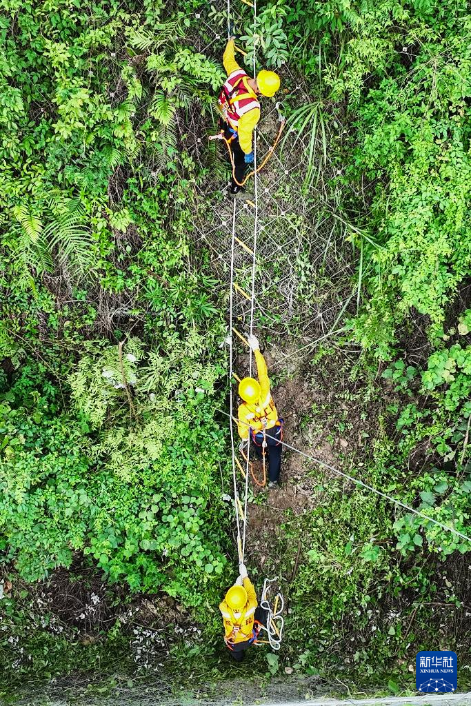 橋隧工人巡查隧道頂部的被動網(wǎng)(7月15日攝,無人機照片)。
