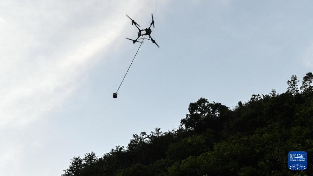 橋隧工人遙控?zé)o人機給隧道山體上的施工點運送混凝土(7月15日攝)。