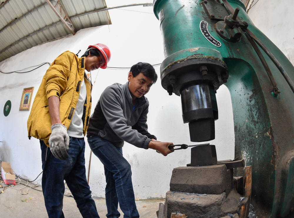 在孜托鎮(zhèn)加日扎村民族手工藝品加工合作社里,寸昆杰向徒弟們示范洛隆藏刀的鍛造工序,他是首位掌握洛隆藏刀技藝的白族人:隨著鼓風(fēng)機吹動,室內(nèi)一股熱浪撲面而來,被燒得通紅的刀片在空氣錘的敲打下火花四濺……