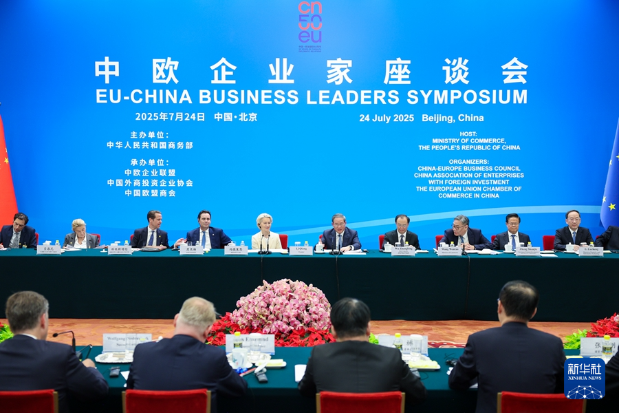 國務(wù)院總理李強7月24日下午在北京人民大會堂同歐盟委員會主席馮德萊恩共同出席中歐企業(yè)家座談會。近60位中歐商會和企業(yè)負責人出席。