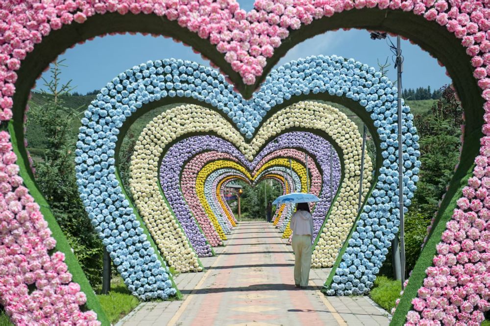 7月22日,在青海省大通縣邊麻溝花海景區(qū),一名游客經(jīng)過(guò)鮮花長(zhǎng)廊。新華社記者 孫瑞博 攝