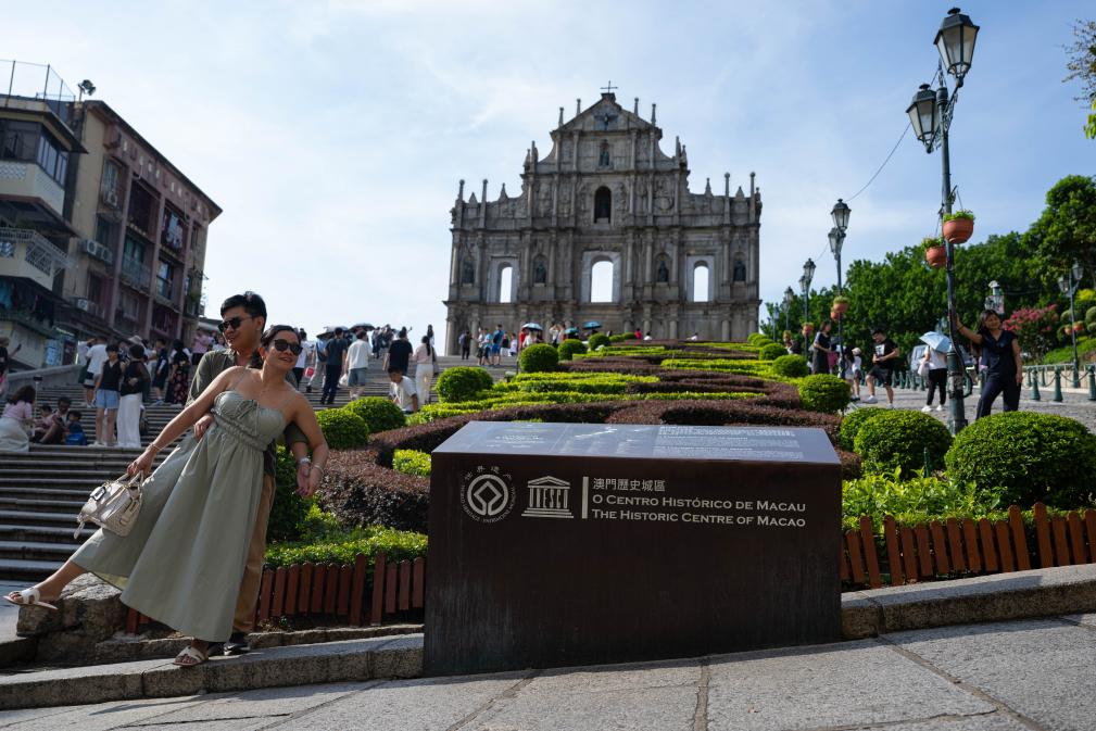 2025年7月9日,游客在澳門(mén)大三巴牌坊前游覽。新華社發(fā)(張金加 攝)