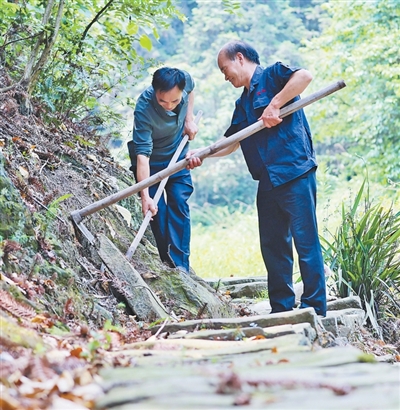 每次上山修路,陳興海和弟弟陳興合都會帶上鐵鍬、鎬頭、鋤頭、斧頭。“石頭硬得很,我一鎬頭下去,手震得疼!”這樣的日子,兄弟倆一過就是8年??傞L約15公里的古道,已經(jīng)修好了約2/3?!拔覀冞€要繼續(xù)往下修?!标惻d海說。