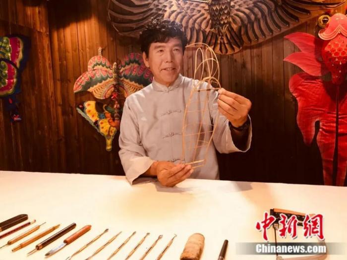 圖為國家級“非遺”項(xiàng)目“天津風(fēng)箏魏制作技藝”第四代傳承人魏國秋正在制作風(fēng)箏