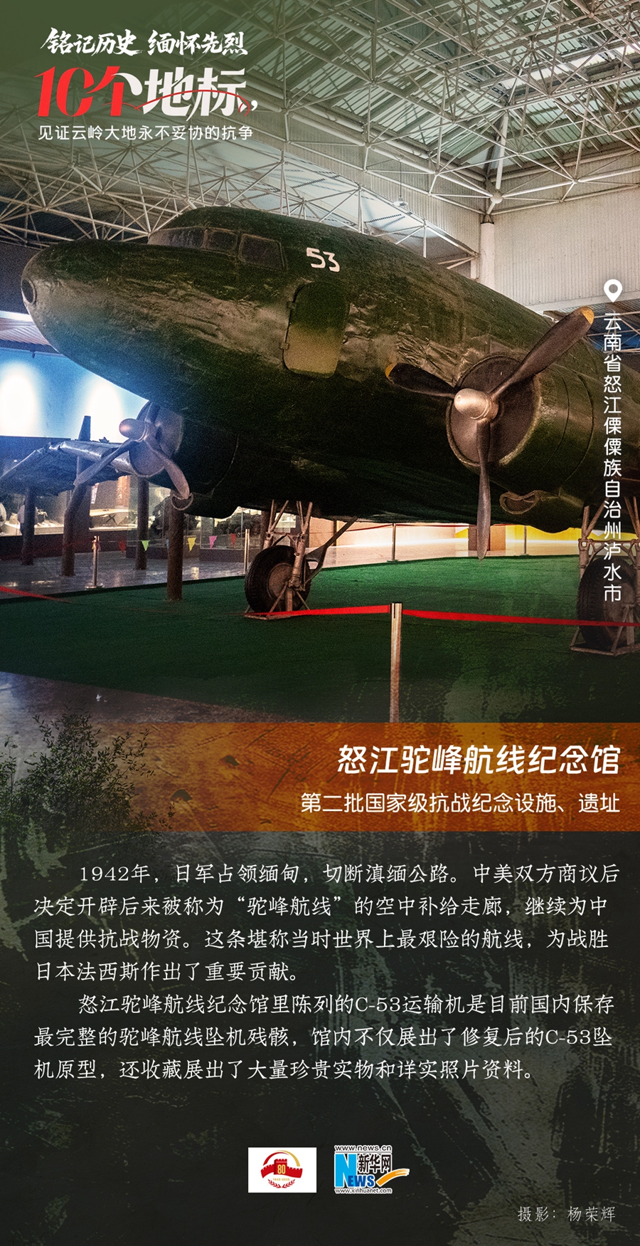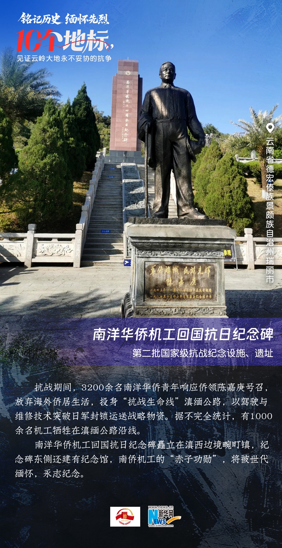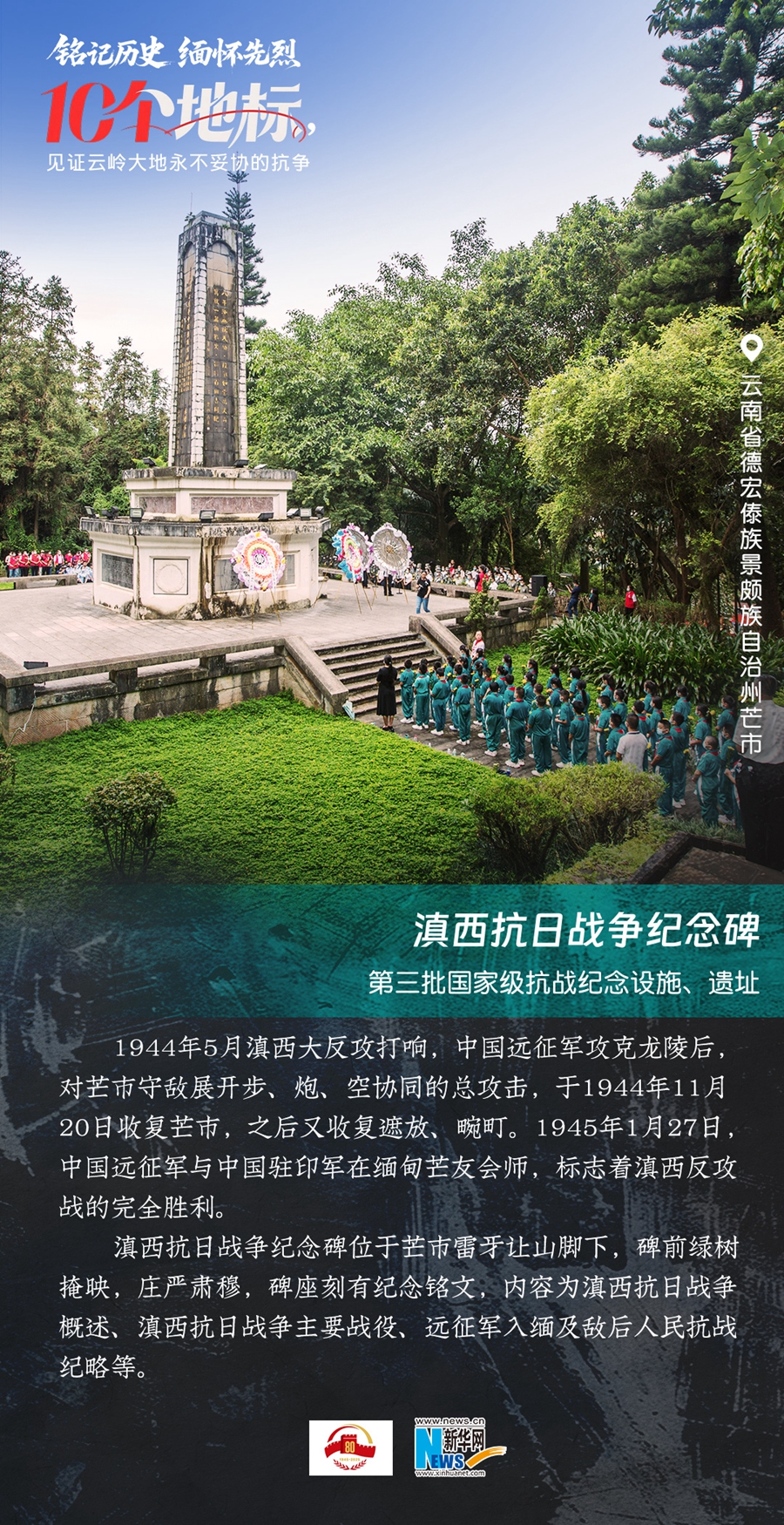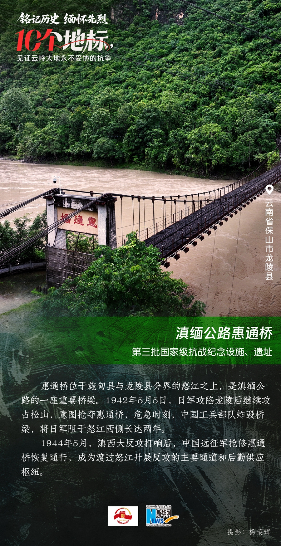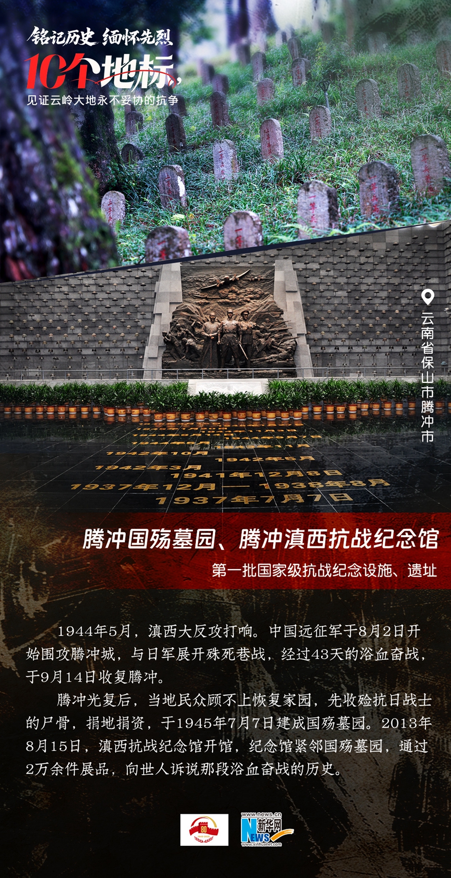??80年過去,曾經(jīng)的戰(zhàn)場硝煙雖散,但英氣永存。在國務(wù)院公布的前三批國家級抗戰(zhàn)紀念設(shè)施、遺址名錄中,云南省共有10個,分別為騰沖國殤墓園、騰沖滇西抗戰(zhàn)紀念館,龍陵抗日戰(zhàn)爭紀念館,國立西南聯(lián)合大學(xué)舊址,抗戰(zhàn)勝利紀念堂,松山戰(zhàn)役舊址,南洋華僑機工回國抗日紀念碑,怒江駝峰航線紀念館,施甸縣抗日江防遺跡群,滇緬公路惠通橋,滇西抗日戰(zhàn)爭紀念碑。它們承載著國人共同的歷史記憶與民族情感,也為我們學(xué)習和傳承抗戰(zhàn)精神提供了現(xiàn)實條件。