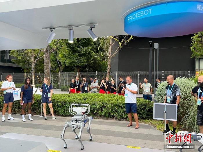 運動員圍觀成都世運村內(nèi)的機(jī)器狗。成都世運會執(zhí)委會供圖
