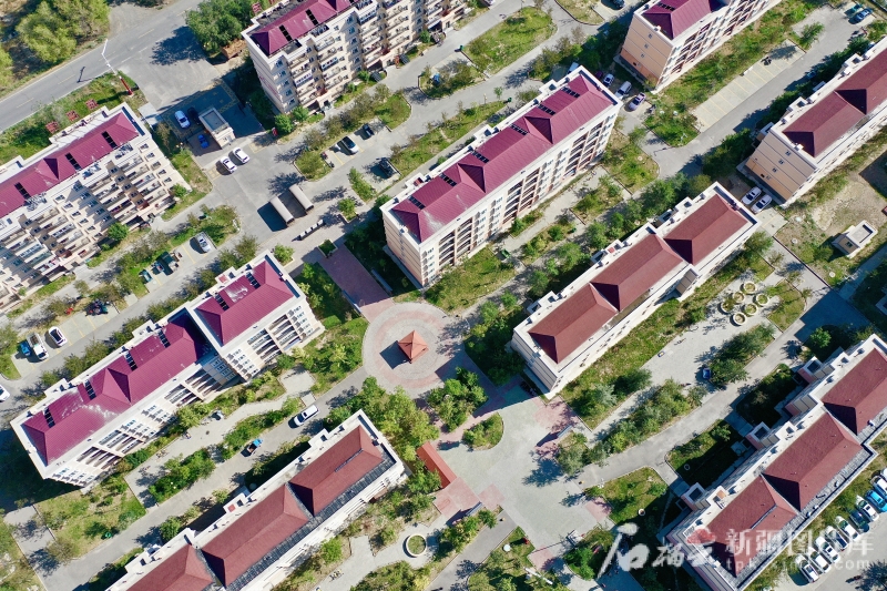 8月12日,昌吉市阿什里鄉(xiāng)的“天鵝小鎮(zhèn)”,一排排整齊的樓房。(無(wú)人機(jī)攝)