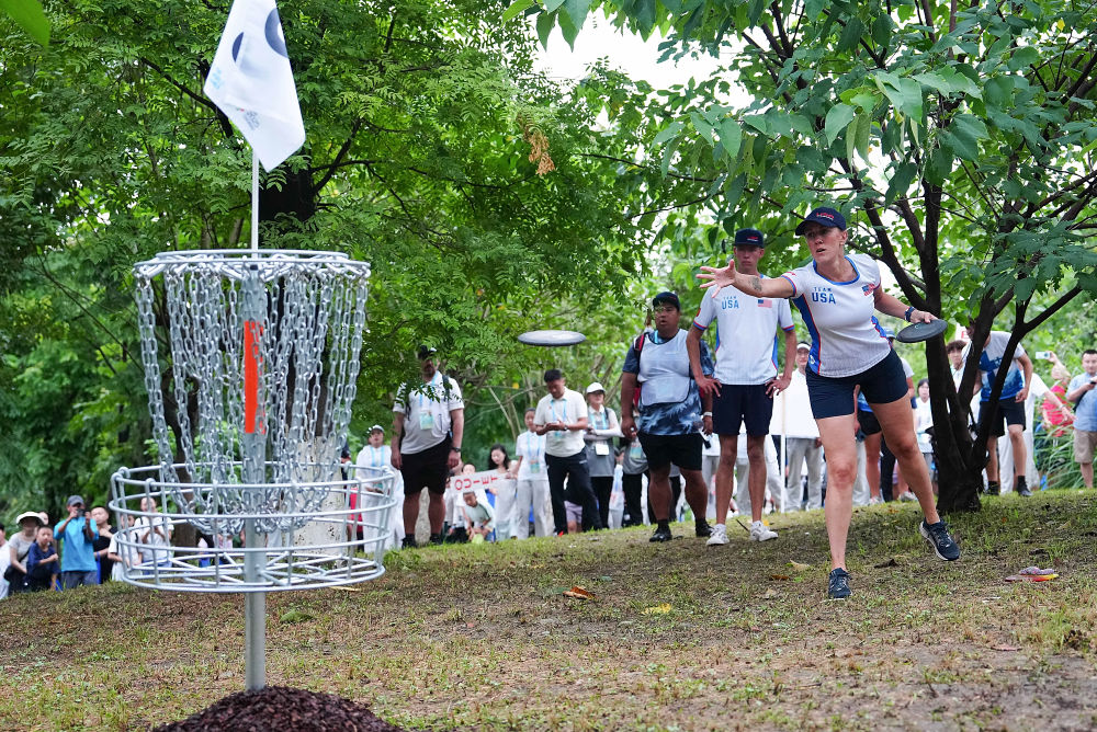 擲準(zhǔn)飛盤比賽在高新區(qū)桂溪生態(tài)公園舉行,觀眾既可登上主看臺(tái)近距離觀賽,也能在公園周邊空地的指定區(qū)域自由觀賽。奧地利選手納拉特很享受比賽過程,“我喜歡這個(gè)場地,有草地、有樹木、有湖泊,滿眼都是綠色”。