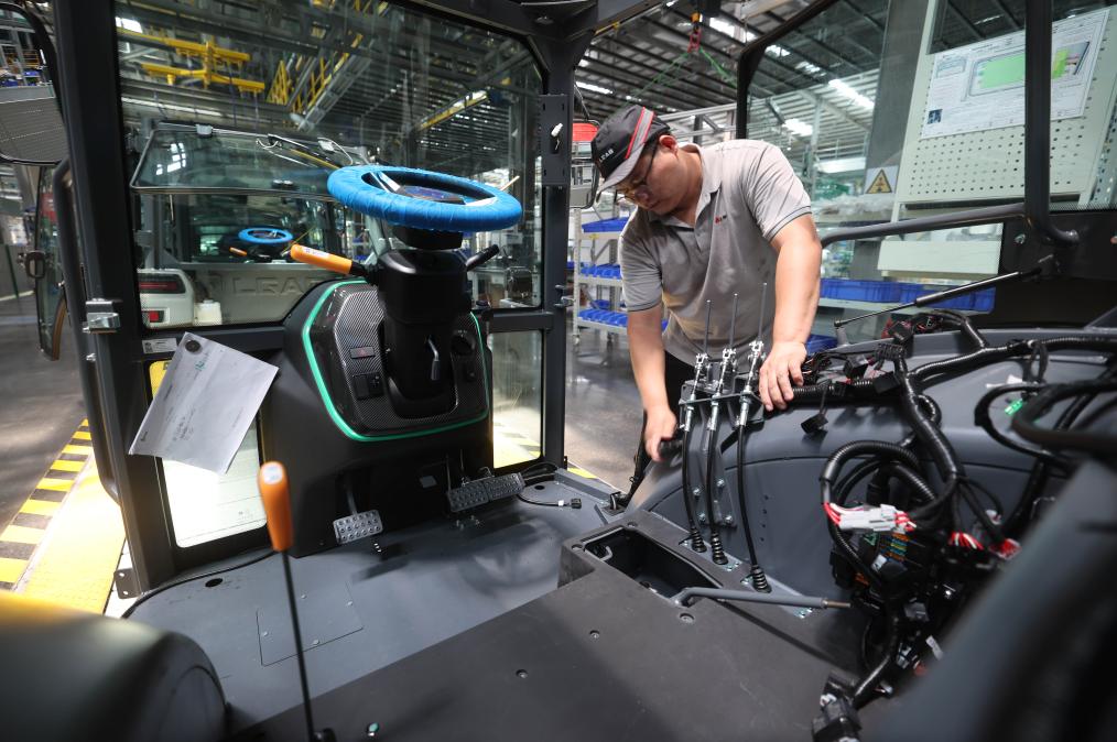 7月27日,工人在山東省臨沂市蘭山區(qū)臨工智慧農(nóng)機(jī)裝備產(chǎn)業(yè)園的流水線(xiàn)上組裝拖拉機(jī)。新華社發(fā)(王彥冰攝)