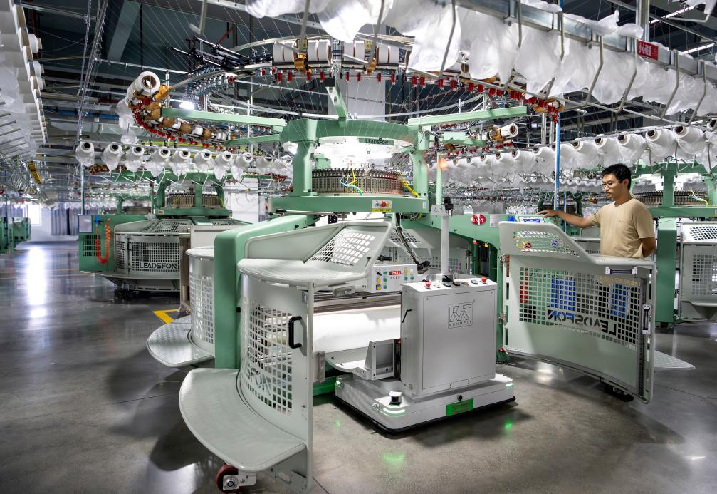 7月24日,一名工人在泉州聯(lián)興發(fā)針織織造有限公司的萊卡+5G智能數(shù)字化生產(chǎn)車(chē)間操控機(jī)器人工作。新華社記者 魏培全 攝
