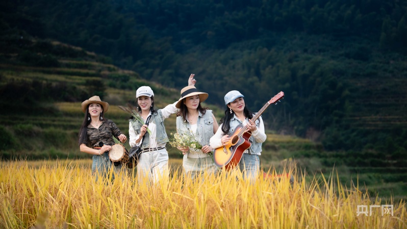 游客們手里的長槍短炮對準(zhǔn)半山腰的梯田,咔嚓聲響個不停。航拍鏡頭下,沉甸甸的谷穗隨風(fēng)搖曳。幾名熱愛音樂的游客在梯田中央彈起吉他,驚飛成群白鷺,雪白的翅膀掠過湛藍(lán)晴空。