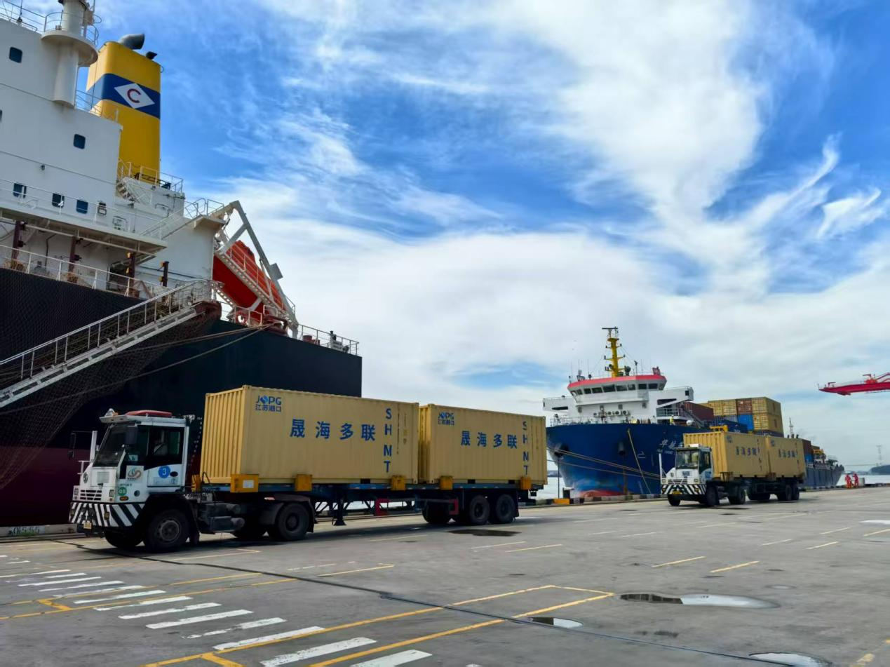 “傳統(tǒng)車皮運輸需多次倒裝,損耗率高、成本大。我們創(chuàng)新采用35噸敞頂箱替代車皮,鐵路直發(fā)龍?zhí)陡酆笸ㄟ^專用吊具直接拆箱裝船,全程貨物不落地、零損耗,每年節(jié)省物流成本近2000萬元?!标珊9究偨浝砉芸】∠蛴浾呓榻B。