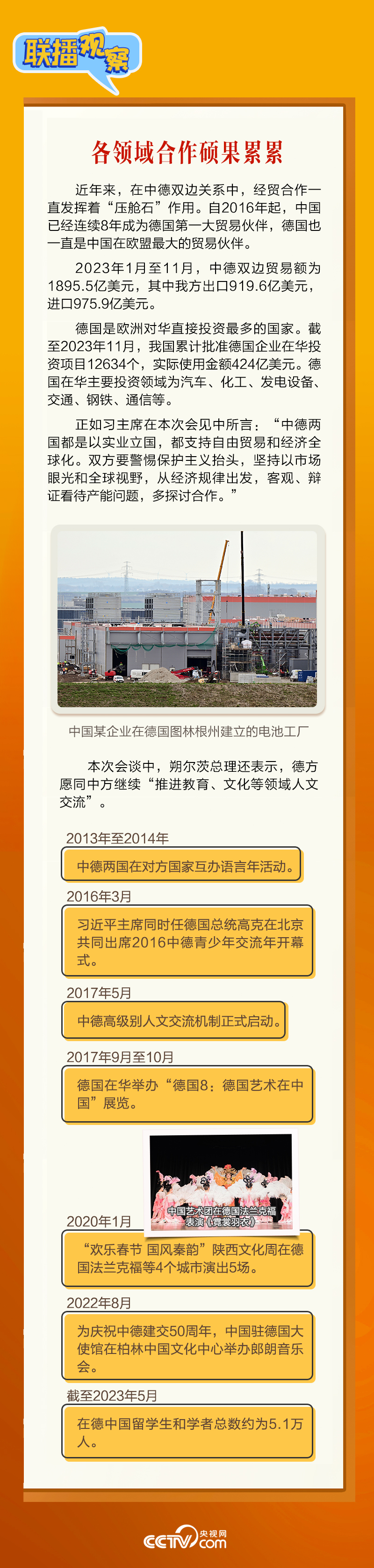4月16日上午,習(xí)近平主席在北京釣魚臺國賓館會見朔爾茨總理。會見中,習(xí)主席強(qiáng)調(diào),要“牢牢把握中德是全方位戰(zhàn)略伙伴這一定位”。中德建立全方位戰(zhàn)略伙伴關(guān)系10年來,兩國如何共同發(fā)展,相互成就?央視網(wǎng)《聯(lián)播觀察》帶您了解。