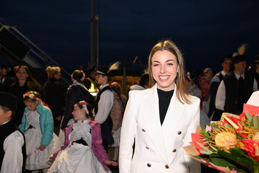 當(dāng)?shù)貢r(shí)間5月8日晚,在匈牙利布達(dá)佩斯國(guó)際機(jī)場(chǎng)歡迎隊(duì)伍中的匈牙利姑娘歐拉·塔瑪拉。新華社記者謝環(huán)馳攝
