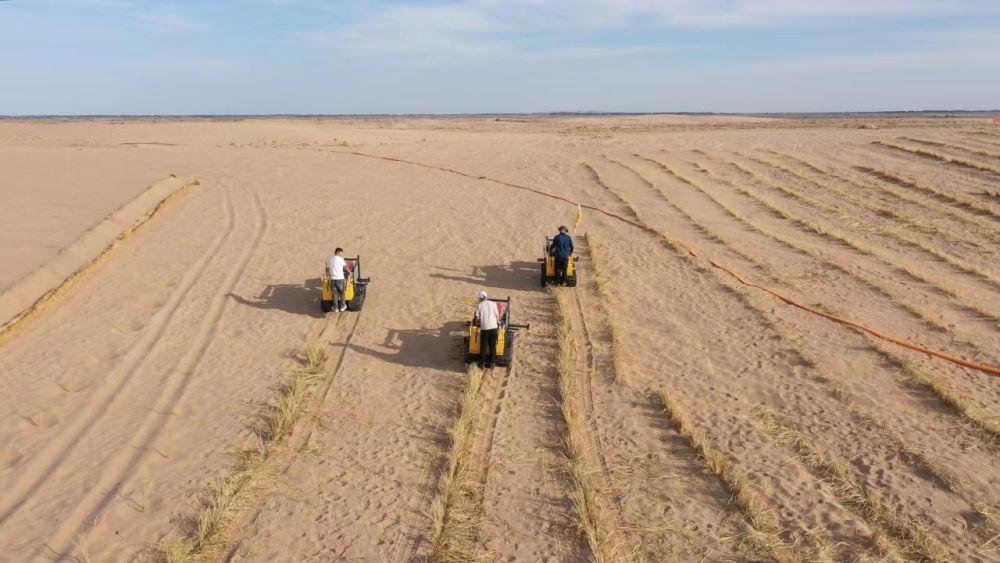 “過去我們不知道什么樣的機械適合在沙漠腹地運行,扎草方格和種苗一直依靠人工,效率很低。”杜永軍說,烏拉特后旗沙化土地面積2065萬余畝,已經(jīng)治理的面積僅有459萬余畝,剩余治理任務重、難度大,很多地方連路都沒有,光靠人工背著草和樹進去,耗時太長,“‘人海戰(zhàn)術(shù)’已經(jīng)難以滿足新時代防沙治沙需求”。