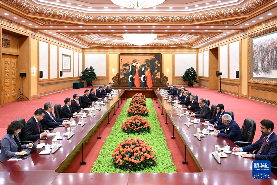 6月7日下午,國(guó)家主席習(xí)近平在北京人民大會(huì)堂會(huì)見來華正式訪問的巴基斯坦總理夏巴茲。新華社記者 申宏 攝