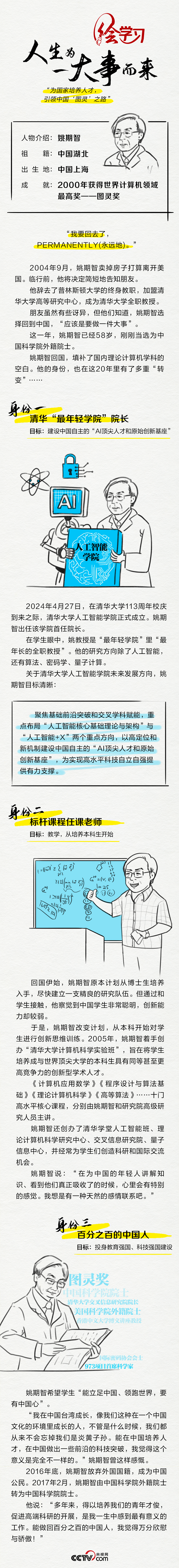 作為一名計算機科學(xué)專家,姚期智是圖靈獎創(chuàng)立以來首位亞裔獲獎?wù)撸彩鞘澜绗F(xiàn)代密碼學(xué)基礎(chǔ)的奠基人之一。2004年,姚期智辭去美國普林斯頓大學(xué)終身教職,回國到清華大學(xué)全職任教。他曾說,“人生為一大事而來”。這件大事,就是“為國家培養(yǎng)人才,引領(lǐng)中國‘圖靈’之路”。央視網(wǎng)《天天學(xué)習(xí)》欄目推出手繪長圖,為您講述姚期智將愛國之情化為報國之行的奮斗故事。
