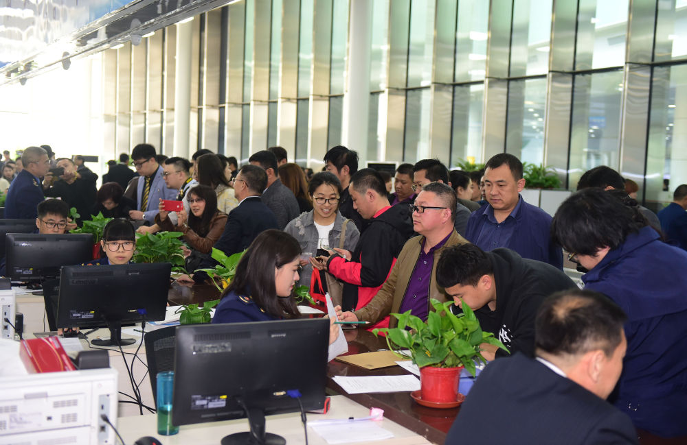 2017年4月10日,中國(遼寧)自由貿(mào)易試驗區(qū)沈陽片區(qū)揭牌當日,眾多企業(yè)咨詢注冊。新華社記者楊青 攝