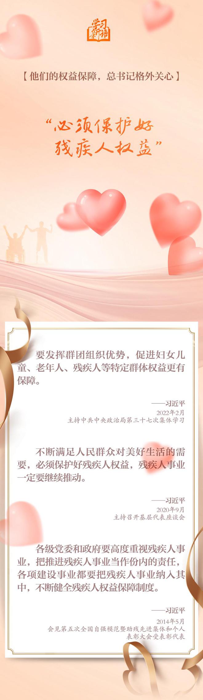 我國有8500萬殘疾人。在習(xí)近平總書記心中,殘疾人是一個特殊困難的群體,需要格外關(guān)心、格外關(guān)注。總書記的一句句溫暖話語、一次次深情囑托,讓廣大殘疾人心田滋潤、滿懷希望。