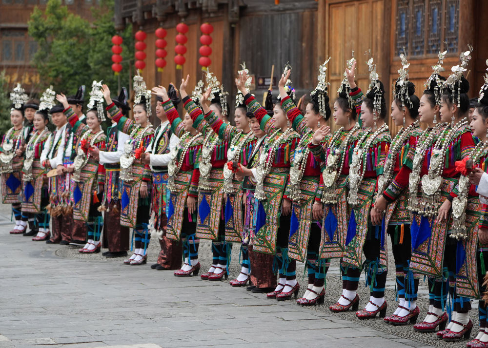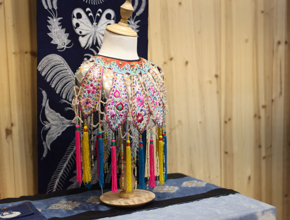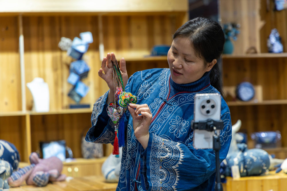 2025年3月14日,村民在肇興侗寨內(nèi)通過(guò)手機(jī)直播銷售刺繡作品。侗繡承載著侗族人的信仰與記憶,年輕繡娘的手藝多半來(lái)自母親傳承,侗族婦女用一針一線將民族古老的神話傳說(shuō)、歷史風(fēng)俗記錄在服飾的紋樣里,讓這門手藝在侗鄉(xiāng)世代傳承。2011年,侗族刺繡被列入國(guó)家級(jí)非物質(zhì)文化遺產(chǎn)名錄。