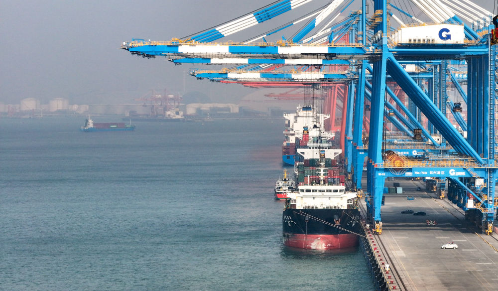 2024年12月31日,遠(yuǎn)洋貨輪在欽州港集裝箱自動(dòng)化碼頭排隊(duì)卸貨(無人機(jī)照片)。新華社記者 呂帥 攝