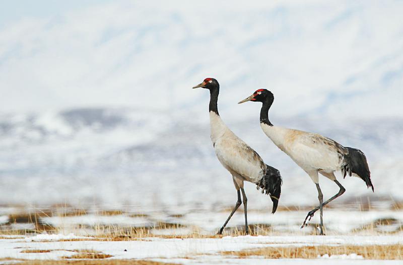 黑頸鶴的“婚配”是極為有趣的,先是雄鶴在雌鶴身邊跳舞,舞蹈停止后,雄鶴又引頸高歌。這時(shí),如果雌鶴愿意“成婚”,便應(yīng)聲伴唱,接著,雌雄雙雙翩翩起舞、高聲歌唱,這就算“婚禮”結(jié)束,雙雙返回草叢中共建新“家”。