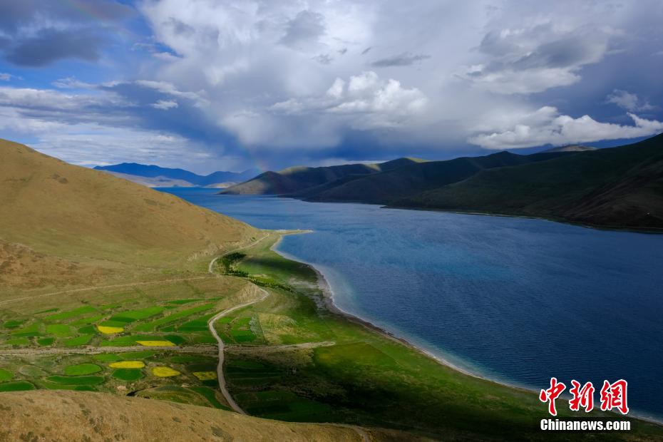 西藏自治區(qū)山南市羊卓雍錯藏語意為“碧玉湖”,湖面海拔4441米,是西藏三大“圣湖”之一。目前正值夏季,羊卓雍錯四周一片翠綠,其間點(diǎn)綴著盛開的油菜花。近日,記者途徑羊卓雍錯時恰遇彩虹出現(xiàn),湖面一片翠藍(lán),風(fēng)光絕美。江飛波 攝
