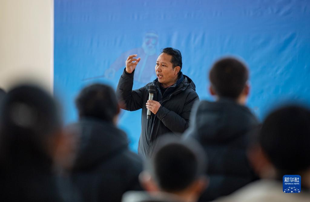 12月30日,西藏自治區(qū)體育局局長(zhǎng)尼瑪次仁在國(guó)家體育總局“大心臟計(jì)劃”西藏自治區(qū)訓(xùn)練營(yíng)開營(yíng)儀式現(xiàn)場(chǎng),向?qū)W員們介紹訓(xùn)練營(yíng)情況。新華社記者 孫非 攝