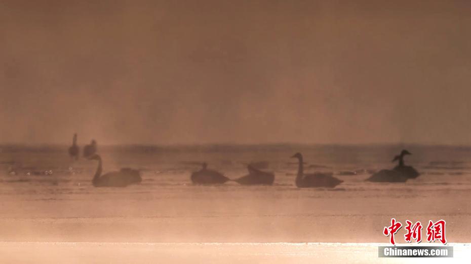 在冬日晨曦,初升的暖陽(yáng)下黑馬河水汽升騰,成群的大天鵝宛如仙子沐浴出水,畫面唯美。馬海青 攝