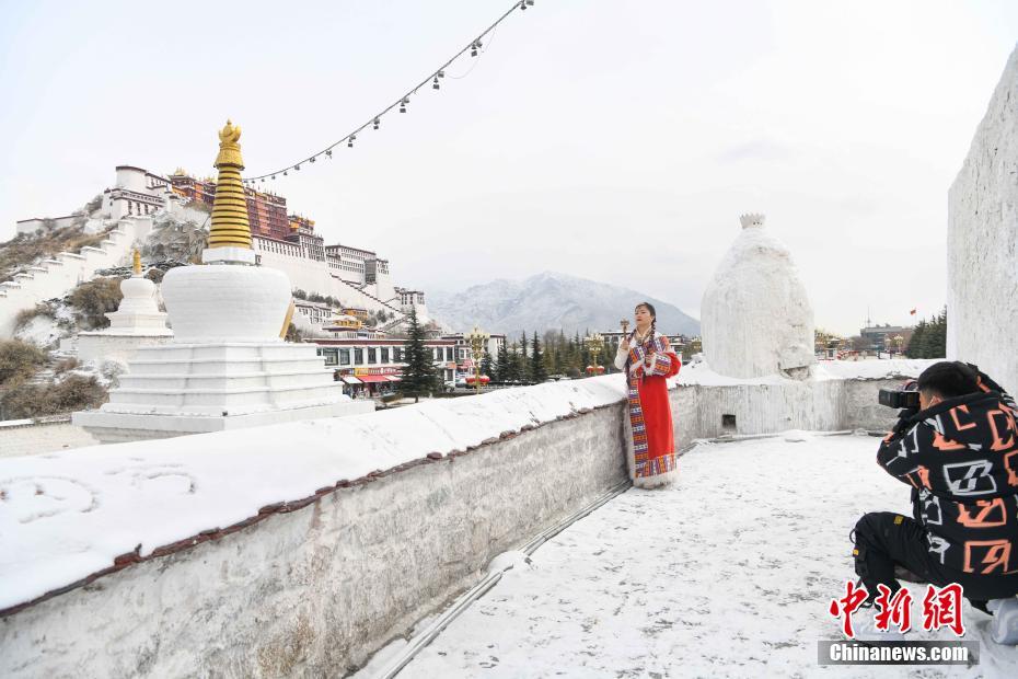 2月21日,游客穿著藏族傳統(tǒng)服飾在布達拉宮拍照留念。當日,西藏拉薩市迎來降雪,雪后的拉薩城區(qū)和周圍群山白雪皚皚,風(fēng)景如畫。 中新社記者 貢嘎來松 攝