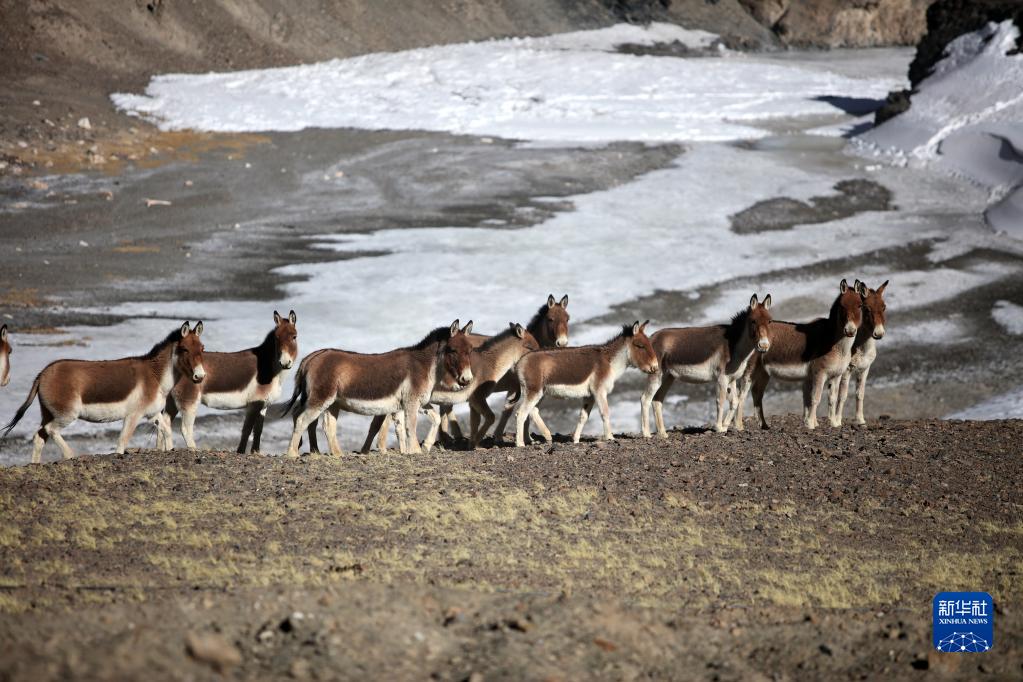 一頭藏野驢在位于西藏自治區(qū)山南市措美縣的哲古錯旁吃草(2021年12月4日攝,手機照片)。新華社記者 沈虹冰 攝